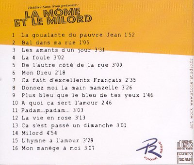 Enregistrement "live" Sax soprano, Accordéon, Clavier, Guitare, Batterie CD de la pièce "La Môme et le Milord" (THEATRE SANS NOM)